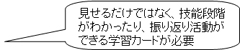 | 1.技の習得表を利用して個々が挑戦する技を決める。 2.技能段階表を利用して技の技能段階を知り、練習する。 3.スポーツミラーを活用して、動きを確認する。 ![]() 4.技能段階表にて自己評価をし、課題を設定する。 5.同じ技の習得を目指す仲間と教えあい学習に取り組む。 6.自己評価能力を高めることで技の習得段階に気がつかせ、更なる向上へとつなげる。 |