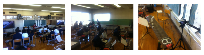 | ○授業の流れ 1.「六段の調」の初段のはじめ、六段の最後の旋律を、プリントを見ながら唱歌によって覚える。 2.教師の範奏により「六段の調」を鑑賞する。(ビデオカメラで箏の演奏を大型テレビに写し、鑑賞する。) 3.箏を使って「六段の調」に使われている奏法を確認する。(ビデオカメラで演奏する手の部分を大きく写し、大型テレビで見ながら確認する。) 【覚える奏法】・引き色 ・かき爪 ・割り爪 ・後押し ・合せ爪 ・裏連(サーラリン) 4.各グループごとに「六段の調」の初段のはじめ、六段の最後を奏法を確認し演奏する。 5.演奏後、箏の音色について感じたことを記入する。 6.全体で交代で合わせる。 ○以前は、生徒に奏法を説明する際、箏の周りに生徒を集めて説明していたため、どうしても生徒は逆から奏法を見ることとなり、いざ自分で演奏をするとなると混乱している生徒が多かった。しかし、ICTの活用により、教師の範奏と同じ角度から見ることによって、より分かりやすく、確実な演奏へとつなげることができた。 |