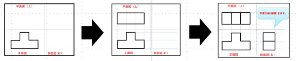| <授業の流れ> 1.図法について 2.製図の手順を知る。 (※ICT活用の場面) 3.簡単な図形を製図する。(個別学習) <ICT活用の工夫> ・製図の手順を細分化し、一つ一つの行程を確認する。 ・1度で理解できなかった生徒には、繰り返し見せて理解の定着を図る。 ・製図の練習問題の答えの手順を用意しておき、描き方が分からない生徒にヒントを与える。 |