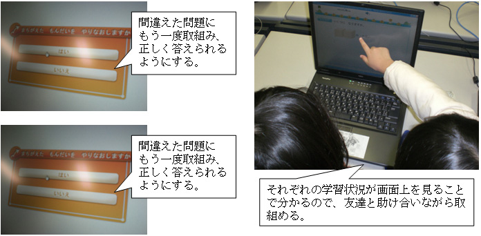 | ○授業の流れは以下の通り。 1.インタラクティブスタディの教材「小2算数 かけ算」に各自取り組む。 2.間違えてしまった問題に、再度取り組む。 3.何度も繰り返し練習問題に取組むことで、学習の定着を図る。 ○自分のペースで学習に取組むことができる。 学習記録を取れば、各児童がどこでつまずきがあるのかを把握しやすい。 間違えた問題にもう一度取組めるなど、一人ひとりに合った支援ができる。 |