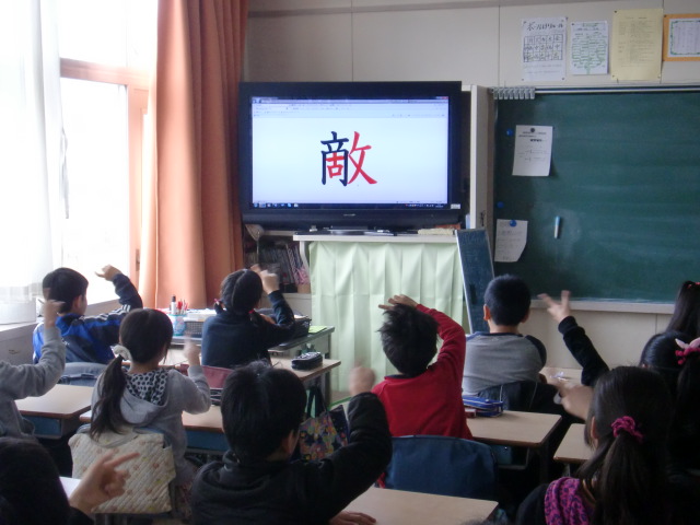 | 1.漢字の音読み、訓読みを確認する。 2.新出漢字を使った熟語を確認する。 3.児童全員で空書きを行う。 ※その際、「漢字のひつじゅん君」を利用する。 |