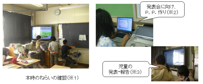 | ○今日のめあて※1.活動内容、活動場所の確認。 ○各活動場所に分かれて、グループごとに活動する。 5年各教室、PC室※2.家庭科室、廊下 ○教室に戻り、活動したことを発表し、活動を共有する※3。 ○次時に向け、活動内容をグループごとに話し合う。 ※1・・・本時のめあてを毎時間パワーポイントで、教室前方の大画面に常時映しておくことで、子 どもたちは常にめあてを確認しながら活動を進めることができた。授業の軸がぶれない。 ※2・・・発表会に向けてのまとめ作成では、パワーポイントを活用し、意欲的に取り組んだ。(特に、課題解決場面での活動写真をP.P.に入れ、有効活用していた。) ※3・・・その場で、子どもの発表と同時に画面上で操作し文章化することで、聞くこと+視覚的な点から、お互いの活動を共有していくことにつながった。また、その活動内容については、次時に向けて紙に書き、クラス掲示板等で共有することも可能であり、ICTの活用法については様々な可能性がある。 |