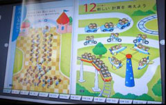 | <授業の流れ> 1.前回の復習をする。( 「1つ分の数」×「いくつ分」=「全部の数」) 2. デジタル教科書の遊園地のアニメーションを見せる。(※以下全て、ICT活用の場面) 3.いろいろな乗り物から、かけ算の式を作る。(個人→グループ) 4.コーヒーカップに乗っている人を1人動かすと、かけざんの式になることを発見させる。(応用) <ICT活用の工夫> 1.デジタル教科書のアニメーションを活用し、児童の興味関心を引き出す。 2.52インチ大型ディスプレイの画面を指して、児童に説明させる。(電子ペンの活用) |