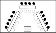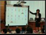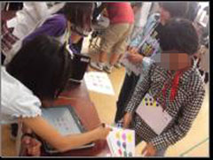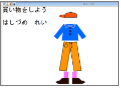 <授業の流れ>![]() 2.本時のめあてを知る。 「自分の好みをはっきり言ったり、相手が気持ちよく買い物ができるよう、心がけて話そう。」 3.服装の名前の言い方の復習。(自作デジタル教材使用) 4.チャンツ 「Do you have a cap?」 5.Activity 「Let’s shopping!」(買い物をしよう!)店員● 客○(図参照) 6.ふりかえり・あいさつ・次時の予告( 「 fashion show 」自分たちのノートを、スターボードの発表機能を使って紹介する。)を聞く。 <ICT活用の工夫> 1.スタディノートの音声録音機能を使って、表現に困っている児童のためにHelpコーナーを設けた。 2.各衣装はエクセルの図形を使って作成し、その後フォトショップで加工した。スタディノートのスタンプ機能を使ってそれらを組み合わせ自分の好みの衣装を作ることができる。また、ファッションショーと題し、スターボードの発表機能を使ってお互いが作った衣装を見合うことができる。 |