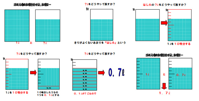 1.スライドを見て、1リットルの入れ物に水がいっぱいに入っているとき1リットルと表すことを確認する。 2.次に、1リットルの水と、途中までしか水が入っていない入れ物を見せ、「はした」の意味を知る。 3.スライドを見ながら、「はしたの数」を「小数」を使って表す方法を知る。 4.身近にあるものや生活でどのような小数を使っているか発表する。 ○小数の表し方をスライドで見ていくことで理解がしやすくなった。 |