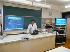 | ○授業の流れ 1.コンテンツの光源・レンズ・スクリーンの位置関係の確認と名前の定義。 2.光源とレンズの距離を変化させたときの、スクリーンまでの距離・像の大きさの変化を確認。 3.数値化するための測定場所の定義と測定方法の説明。 4.次回に行う実験の説明。 ○この方法でのメリットは、以下の通りである。 ・黒板に直接映像を写しているので、チョークを使って書き込みができ、説明しやすい。 ・映像を利用しないときには、プロジェクターの電源を切ることによって、黒板全面を利用できる。 ・機材の準備に費やす時間を短縮できる。 ・高輝度のスクリーンに比べて、目に対する負担が小さく、長時間見ていることが出来る。 |