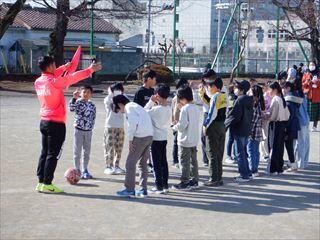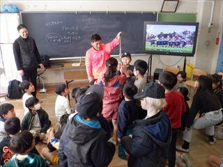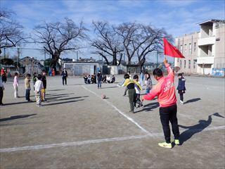 その後、校庭に出てデフサッカーの体験をしました。Deaf(耳が聞こえない)なので、全員耳栓をして、声を出してはいけないというルールで行いました。夢中になると審判が旗を挙げても気付かず、プレイを続けてしまうことに気付いたようです。
