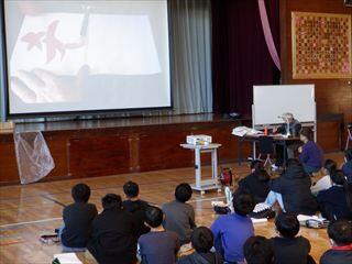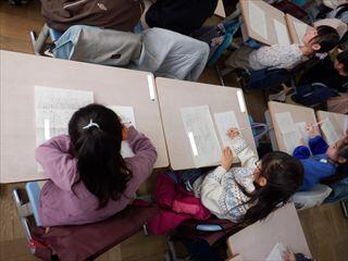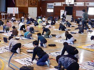 新年の書初め会を行いました。1・2年生は硬筆での書写を教室で行い、3年生以上は体育館に新聞等を広げて毛筆で行いました。今年も地域の書道教室の先生にご指導いただくことができました。
