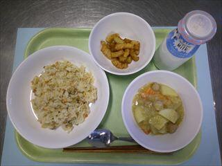 チャーハン、いかのかりん揚げ、レンズ豆の煮込み、牛乳