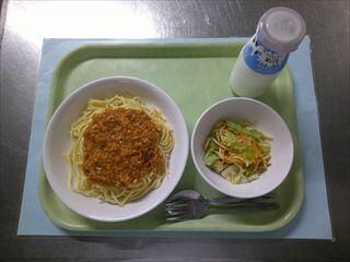 大豆入りミートソース、パリじゃがサラダ、牛乳