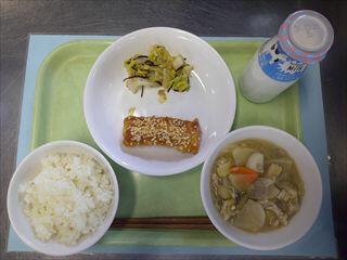 ごはん、イカのかりんとう揚げ、白菜のごま昆布、たぬき汁、牛乳