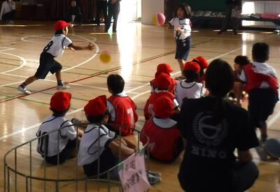グループに分かれて、1年生の子供たちが日野八小のことを園児に紹介して、質問を受けたり、手遊び歌で一緒に遊んだりしました。