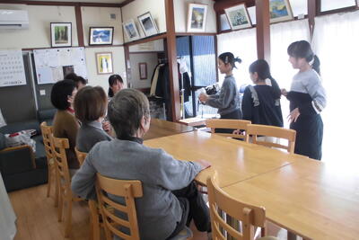 地域サロンではお年寄りの方々との交流を行い、世代間のふれあいを楽しみました。また、子育てカフェでは、遊びを通して小さいお子さんの相手を積極的に行い、地域の子育て支援の場にも関わりました。