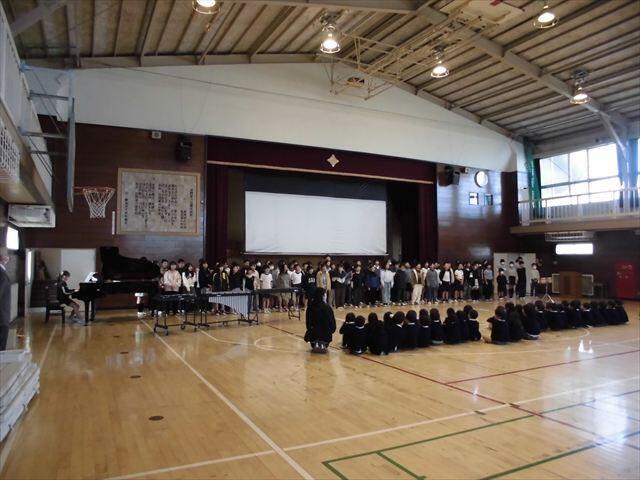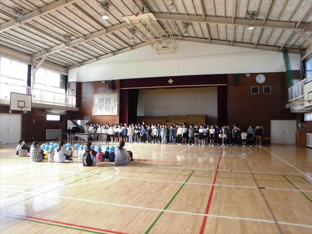 まずは、5年生が先日の音楽会で発表した「サークルオブライフ」と「いのちのまつり」を披露し、迫力ある歌声と演奏で歓迎しました。