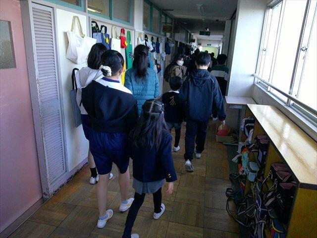 その後は、学校探検です。 来年度、1年生として入学してくる園児たちと手をつなぎ、校舎内を案内しました。