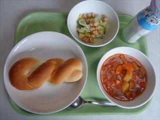 ミルクパン、ハンガリーシチュー、フライビーンズサラダ、牛乳
