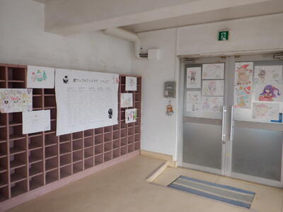 会場の体育館の出入り口は、イラストクラブの子供たちの全面協力で華やかに飾られています。