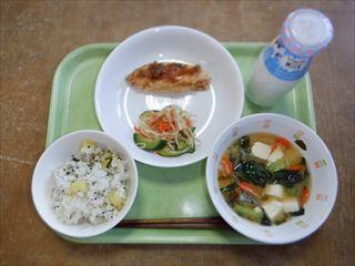 さつまいもごはん、さけの南蛮漬け、切干し大根の梅あえ、みそ汁、牛乳