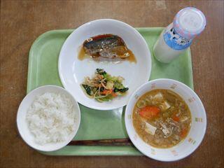 ごはん、魚の照り焼き、ゆで野菜のごまあえ、とりごぼう汁、牛乳