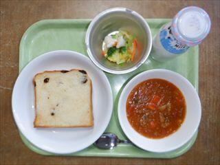 レーズントースト、チリコンカン、花野菜サラダ、牛乳