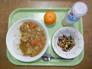 大根カレーライス、ひじきのカラフルあえ、みかん、牛乳