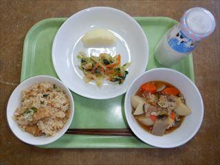 こぎつねごはん、いも煮、からしあえ、りんご、牛乳