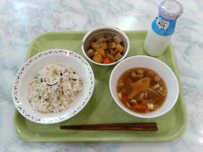 *茎わかめご飯・高野豆腐と野菜の煮物・ひっつみ・牛乳