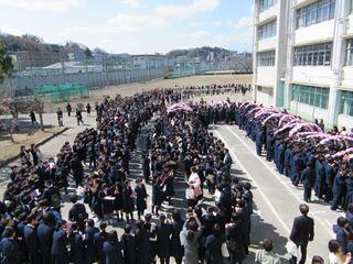 全校朝礼では、校長先生より震災の話と卒業式にむけての話がありました。来週金曜日には卒業式です。それぞれの学年の思いを込めて、卒業式の練習頑張っています。