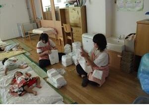 ↓ 学習室にはクラスごとに集められた提出物の山が‥