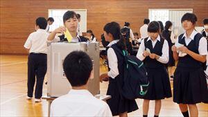 昨日の午後、生徒会役員選挙が行われました。立会演説会では、それぞれ抱負や意気込みを披露し、支持を訴えていました。放課後2,3年生は体育館で1年生は食堂で投票を行い、投票終了後選挙管理委員が開票作業を行いました。無事全員当選となり、新体制が承認されました。