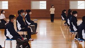 今日は分散登校で1年生が6クラス、学活を体育館と食堂で実施していました。久々の校舎内での活動に教員側には緊張感がありました。1年生も初めてのクラス活動に緊張気味でしたが、学校生活の説明や自己紹介を通して早く馴染もうとしていました。