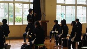 ↑ 体育館での学活風景 生徒手帳の説明中(1年生)