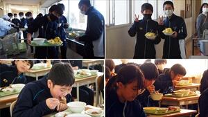 2学期の給食は今日が最後。クリスマスを控えスパイシーチキンやプチチョコケーキが提供され、廊下ではジャンケン大会が熱気を帯びていました。食欲旺盛な中学生たちは大盛や超大盛に挑戦していました。栄養士さんや調理師さん、ご苦労様でした。