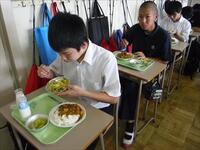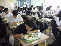 夏休みが終わり、今日から給食も始まりました。給食委員の号令で、久しぶりの給食が戻ってきました。今日の献立は、カレーライス・サラダ・ぶどうです。生徒は、大好物のカレーライスにお替りの行列ができていました。