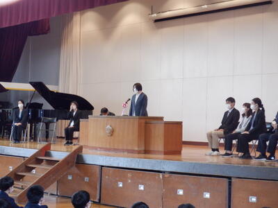 学活終了後は、今年度で三沢中学校を去られる先生方との離任式が体育館で行われました。異動する先生方より生徒に対して、温かいお言葉を頂くことが出来ました。異動される先生方、これからもご活躍をお祈りします。