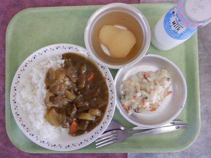 献立:大根カレーライス・ホットポテトサラダ・果物(洋梨)・牛乳