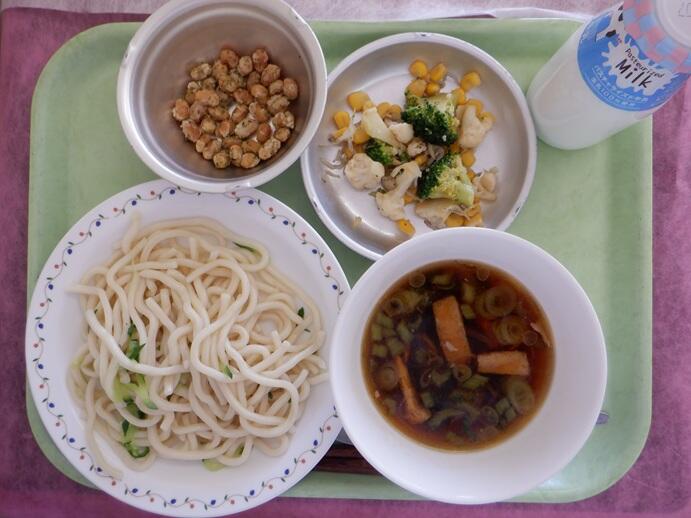 献立:肉汁うどん・青のり大豆・じゃこ入り和え物・牛乳