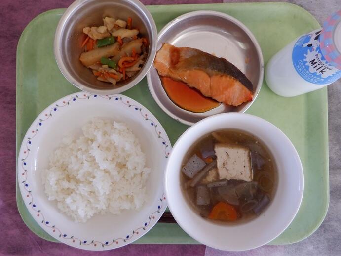 献立:御飯・魚の照り焼・れんこんの金平・のっぺい汁・牛乳