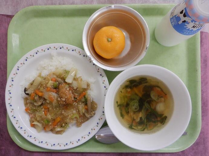 献立:れんこん肉団子の野菜たっぷり丼・春雨スープ・果物(みかん)・牛乳
