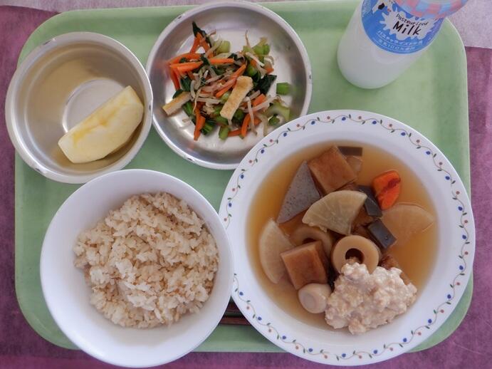 献立:茶飯・鶏味噌おでん・お浸し・果物(りんご)・牛乳