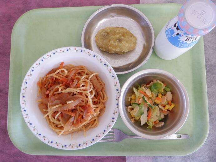 献立:ナポリタンアラビアータ・ナッツサラダ・スウィートポテト・牛乳