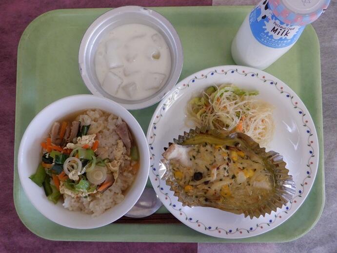 献立:卵クッパ・魚のきのこ焼・春雨ソテー・アロエヨーグルト・牛乳