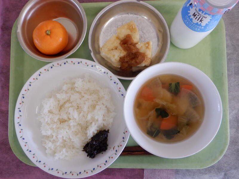 献立:御飯・海苔の佃煮・揚げ出し豆腐のおろしかけ・すいとん汁・果物(みかん)・牛乳