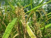 穂が熟し黄色に色づき穂が垂れてきました。全体に実っているが、一部出穂が遅かった陸稲は穂の色が青いものが一部ありました。穂に一部黒い粒があるので、小林和男さんから「見てみないと分からないが、現状では大丈夫。一度様 子を見に行く」と話されました。また、稲刈りを9月25日(木)に予定していますと話すと、「水を抜いて、乾かして平山陸稲を青い葉を枯らして、稲刈りに備える」ことが重要ですと助言をいただきました。