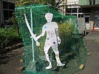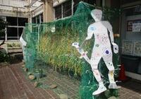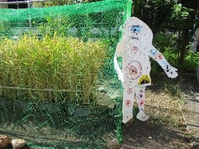 * 黄色く色づいた平山陸稲をスズメなどの鳥から守るためにわかば教室の子供たちと先生たちとで案山子を作り
