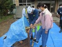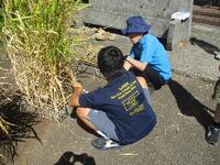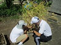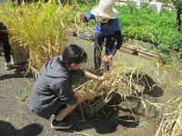 その後、わかばの先生たちが子供たち一人一人の傍について、平山陸稲の刈り取りに取り組ませした。小学生たちは初めて鋸鎌を扱う子も含めて、夢中になってサクサクと稲穂を刈り取っていきました。中学生たちも最初は遠慮していましたが、やり始めると、楽しそうに次々に稲刈りを行っていきました。刈り取った平山陸稲を束ねて、はざかけのパイプにかけていきました。散らばった陸稲の藁くずなどを竹ぼうきできれいにする子供や、刈り取ったコンテナボックスの土を奥の場所に捨てに行く子供や、スズメの食害から平山陸稲を守るための網掛けを手伝う子供など、わかば教室の子供たちは小中学生一緒になって働いていました。一か月後の脱穀が楽しみだと言う子供もいました。風もなく少し蒸し暑い穏やかな日差しのなかの稲刈りとなりましたが子供たちは、充実した時間を過ごしたと思います。