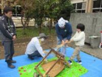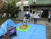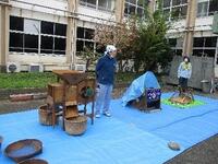 郷土資料館の収蔵農具を使用して平山陸稲の脱穀作業を行いました。郷土資料館学芸員の金野さん、白川さん、郷土教育コーディネーターの高橋さん、わかば教室の先生と子供たちが一緒に脱穀体験を行いました。最初に、脱穀で使用する農機具の説明と扱いについて、使用する順に、学芸員の金野さんから説明を受けました。
