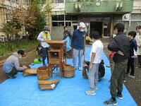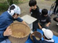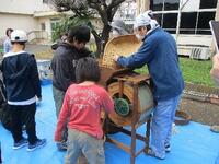 * 二束目は足踏み脱穀機を使って一人ずつ脱穀体験をしました。初めは回転させるのに苦労する子供もいましたが、すぐに慣れて順回転させられるようになりました。稲穂をまんべんなく押し当てて、籾を取り外すにはコツがありましたが、徐々になれて稲穂を広げたり、向きを変えたりして籾を外せるようになりました。