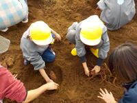掘っても掘ってもまだまだ抜けません。みんなで力を合わせてどんどん掘り進めるとやっと抜けました!