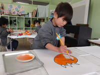 まずは、赤・青・黄の水彩絵の具を白い画用紙にスポイトで垂らします。 紙を持ち上げて縦にすると絵の具が流れはじめるので軌跡を楽しんだり、ティッシュで拭いたり、半紙に描いたりしながら、いろいろな色や色と色の混ざり、広がりなどの面白さも感じていました。